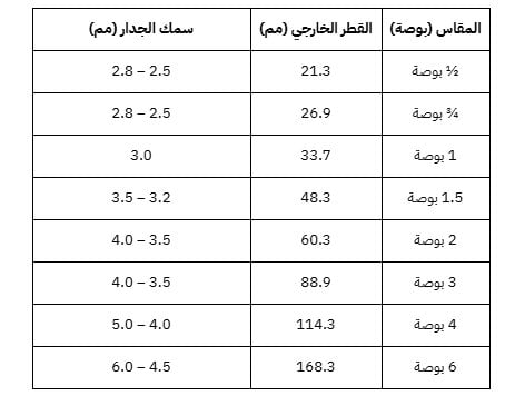- بالنسبة لمقاس 2 بوصة فيبلغ القطر الخارجي نحو 60.3 مم مع سمك جدار بين 3.5 و4.0 مم، ويُعد مناسبًا لـ شبكات المياه الرئيسية داخل المباني والمشاريع.