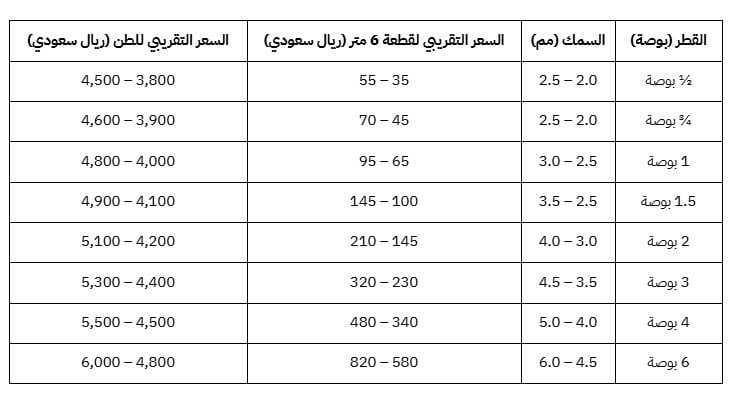 - في المقاسات المتوسطة مثل ¾ بوصة إلى 1 بوصة، يتراوح السعر بين 3,900 و4,800 ريال للطن، ويبلغ سعر القطعة بطول 6 أمتار ما بين 45 و95 ريالًا حسب السمك وجودة التصنيع.