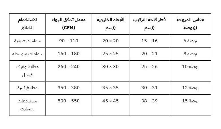 • اختيار المقاس المناسب حسب مساحة المكان لتجنب ضعف التهوية أو استهلاك طاقة زائد.